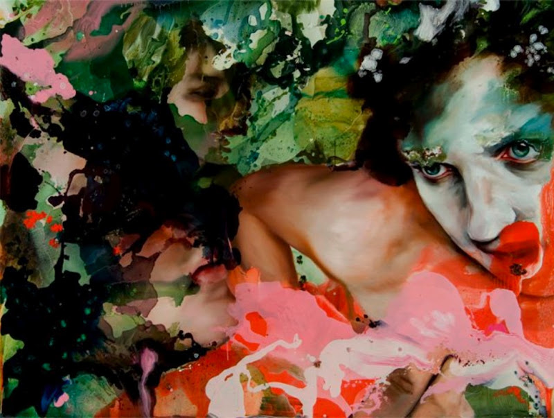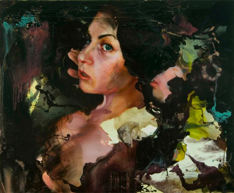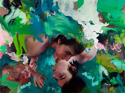 These tensions are heightened as paint itself becomes a tool for the disturbance; a main protagonist in the story and a carrier of meaning. Violent and seductive, threatening and unpredictable it complicates the image leaving us unsure if the figures are being birthed or eaten away; if the paint is taking control, acting as savior, interrupting, manipulating or providing the stimulus for the relationship. Physicality of the paint both cankers and covers the narrative caressing the fine line between victim and volunteer. There is a desperate human quality in the work, one that embraces the flawed hero.... you know what was supposed to have happened but you also know it didn't. " (ANGELA FRALEIGH)