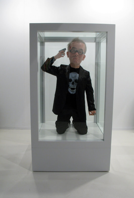 Spanish artist Eugenio Merino's sculpture, which shows a Hirst figure pointing a gun at himself and blowing his own brains out, is meant to be a comment on the British artist's own £50mdiamond-studded skull, For the Love of God.