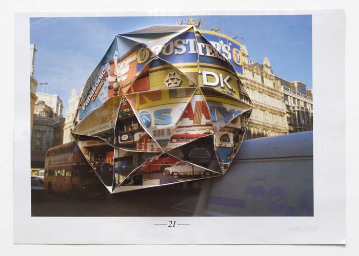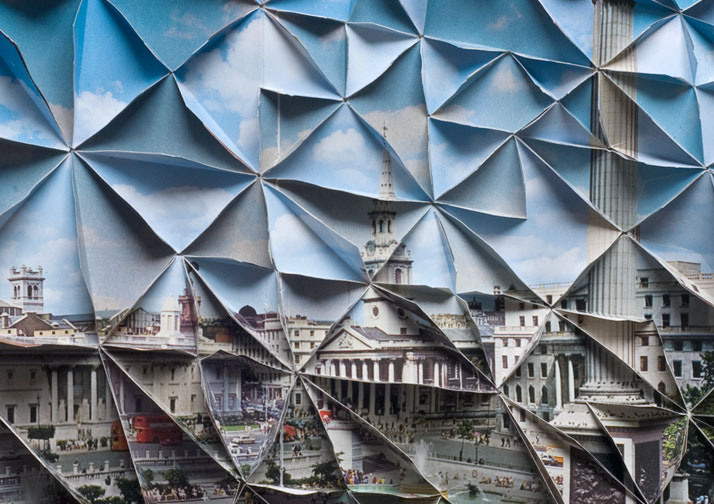 The series consists of collages comprised of found book pages sourced from atlases, encyclopedias and guidebooks. Reynolds scours used bookshops and flea markets to recover images of landmarks, monuments and landscapes printed at a similar scale and shot from approximate vantage points by separate photographers at different points in time. The two corresponding bookplates are merged through a series of incisions and folds, which result in an undulating three-dimensional honeycomb like surface in which the entirety of each page is preserved.
