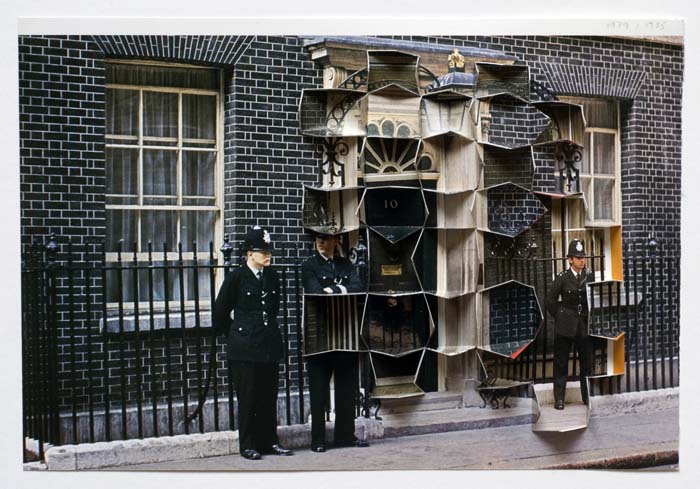 In addition Reynolds collages serve as a commentary on photography’s notion of the ideal perspective and the medium’s inability to operate without bias. The repetitious perspective in the found book pages confirms man’s conscious or subconscious impulse to represent place with strict precision. This synchronistic popularized documentation inevitably influences society’s relationship to place through democratic identification and classification, replacing objective experience and associations with superficial constructions. In the process sites become cultural signifiers with impenetrable auras, fixed in the infinite present.